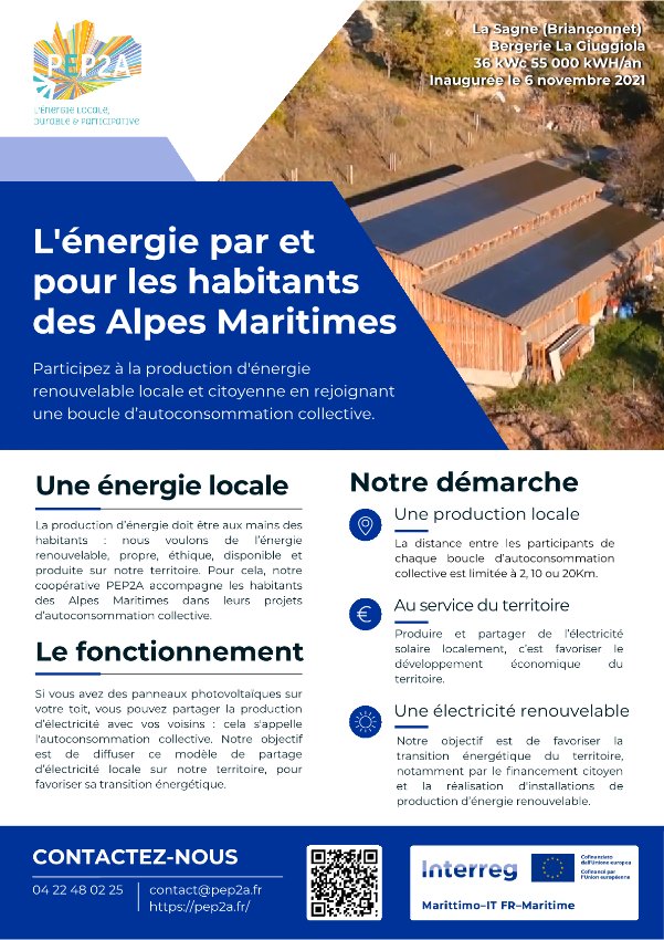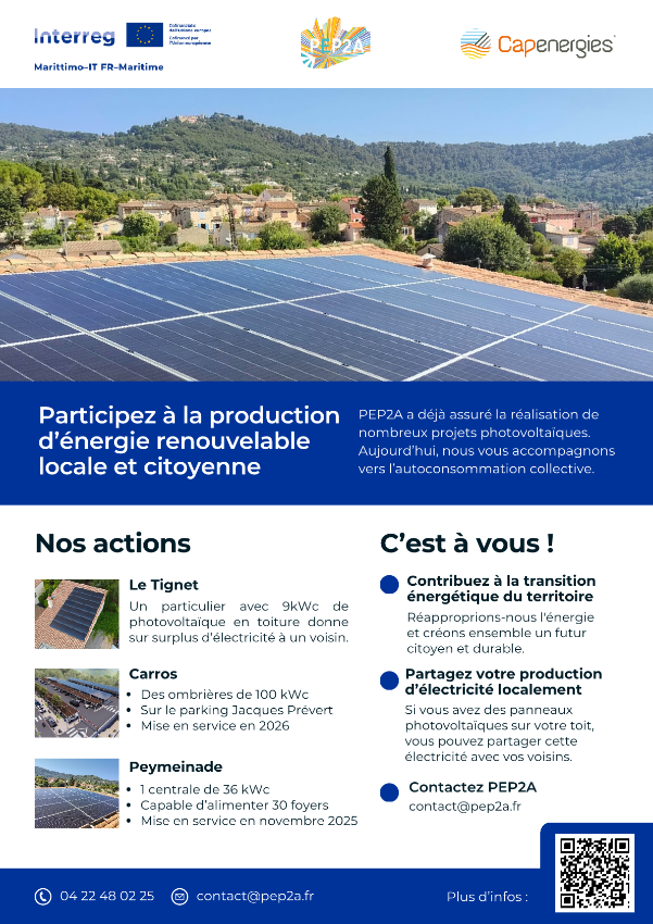 Avec le soutien du projet européen INVECE, la Société Coopérative d’Intérêt collectif PEP2A en tant que Communauté d’Energie Renouvelable accompagne localement les habitants, les entreprise et collectivités locales des Alpes-Maritimes dans leurs projets d’autoconsommation collective.