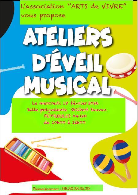 L'association Art de VIvre propose des ateliers d'éveil musical les mercredis Salle polyvalente Gilbert Sauvan, Peyroules (04) Renseignements complémentaires: voir l'affiche