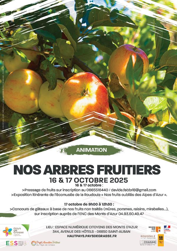 -Concours de gâteaux avec des fruits non traités locaux provenant soit de nos jardins soit ramassés en pleine nature (mûres, pommes, raisins, mirabelles, ...). Ce concours se déroulera de 9h à 12h le vendredi 17 octobre 2025 - inscription et renseignement auprès de l'Espace Numérique Citoyens SudLabs des Monts d'Azur au 04.93.60.49.47