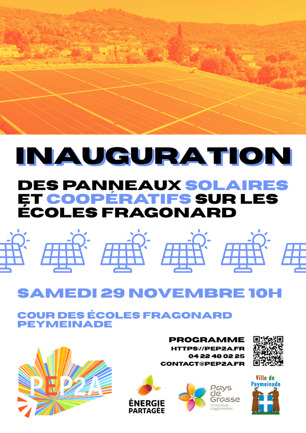 PEP2A a le plaisir de vous convier à l’inauguration de notre nouvelle installation photovoltaïque sur le groupe scolaire Fragonard de Peymeinade. 65 modules photovoltaïques de 550Wc, soit une puissance crête totale de 35.750Wc, pour une production annuelle d’environ 45000kWh, soit l’équivalent de la consommation annuelle hors chauffage d’une dizaine de foyers inscription conseillée via ce formulaire