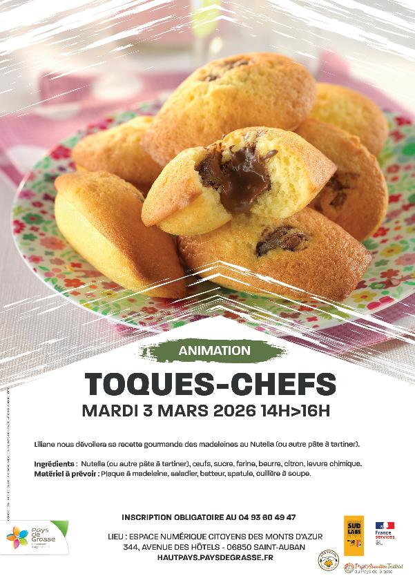 Lieu : Saint-Auban 06 Montrer le lieu sur la carte Le mardi 3 mars 2026 à 14h, Liliane partagera sa recette gourmande de madeleine au Nutella (ou autres pâtes à tartiner). Places limitées, sur inscription auprès de l'ENC SudLabs des Monts d'Azur au 04.93.60.49.47 Lieu : Espace Numérique Citoyens SudLabs des Monts d'Azur - 344, avenue des Hôtels - 06850 Saint-Auban Lien sur site Internet Auteur : FILIPPOT Anna ( afilippot@paysdegrasse.fr )