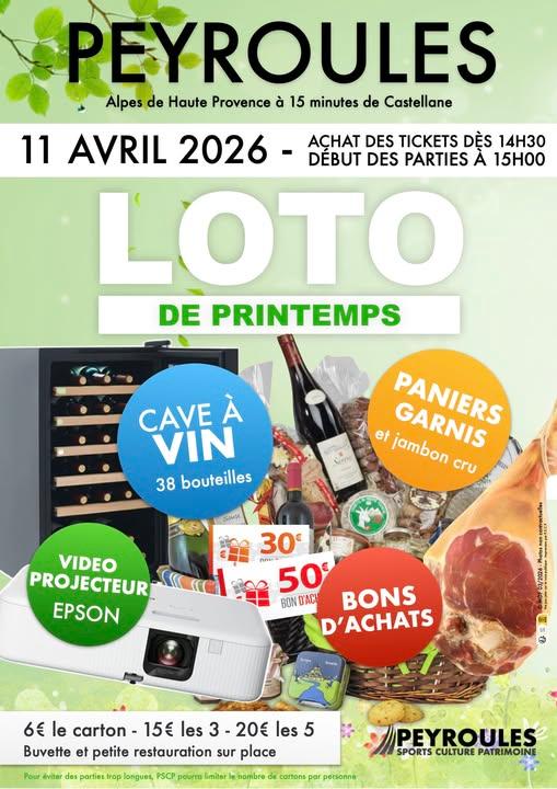 On vous donne rendez-vous le samedi 11 avril 2026 pour notre 3ème Loto de Printemps organisé par Peyroules Sport Culture et Patrimoine à partir de 14h30