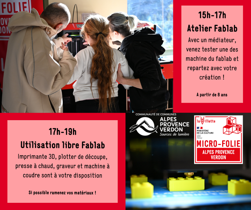Lieu : Peyroules Montrer le lieu sur la carte La Micro-Folie s’installe à Peyroules du mardi 14 avril au samedi 18 avril. Jeudi 16 Avril 2026 15h-17h : Atelier Fablab (imprimante 3D) 17h-19h : Utilisation libre Fablab Auteur : CLUET Ce