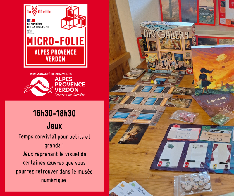 Lieu : peyroules Montrer le lieu sur la carte La Micro-Folie s’installe à Peyroules du mardi 14 avril au samedi 18 avril. Vendredi 17 Avril 2026 16h30 - 18h30 : Jeux pour petits et grands Auteur : CLUET Ce